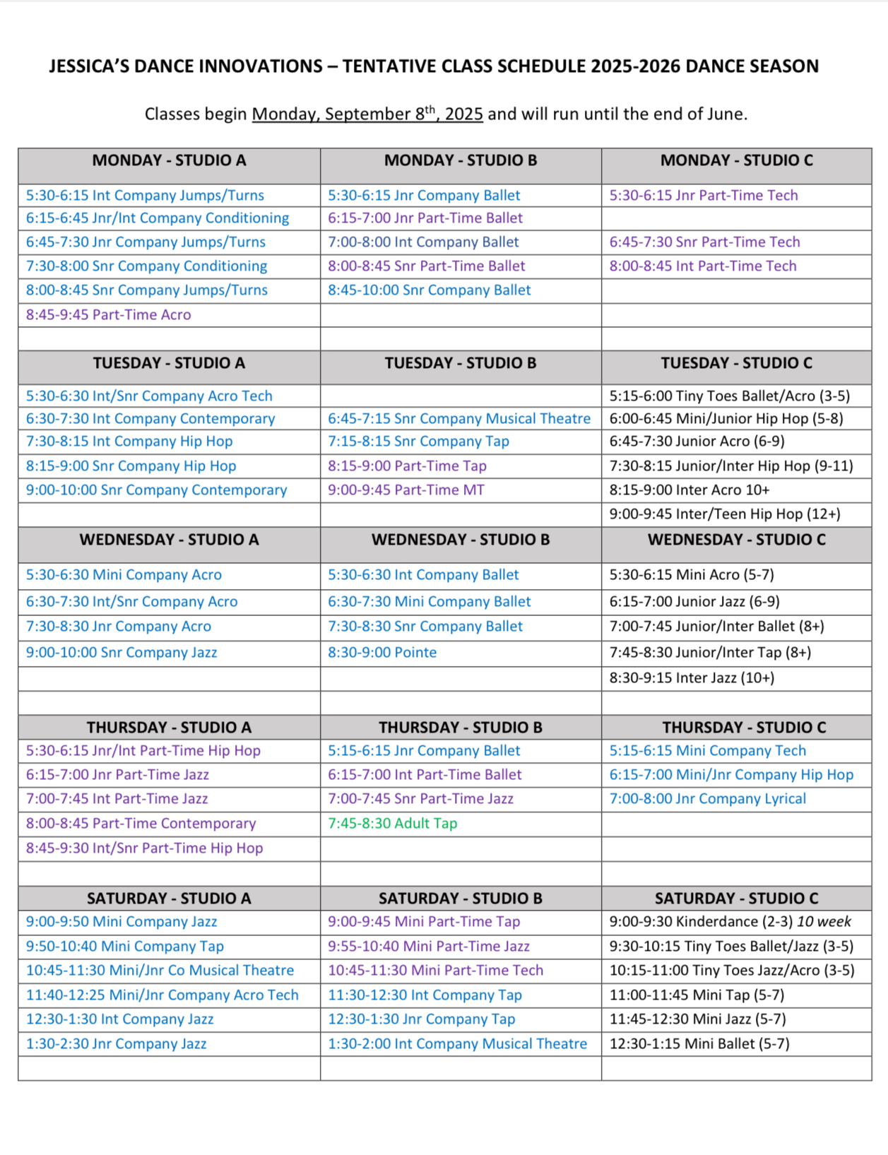Below is our 2025-2026 Dance Schedule. All recreational classes are listed in black, full-time competitive classes are listed in blue and part-time competitive classes are listed in purple. Please be sure to email us at jessdanc@jessdanceinn.ca if you are new to the studio and have any questions about enrollment. It is important to ensure that you are registering for the appropriate programs and we are happy to help you find the best suited classes for you!
