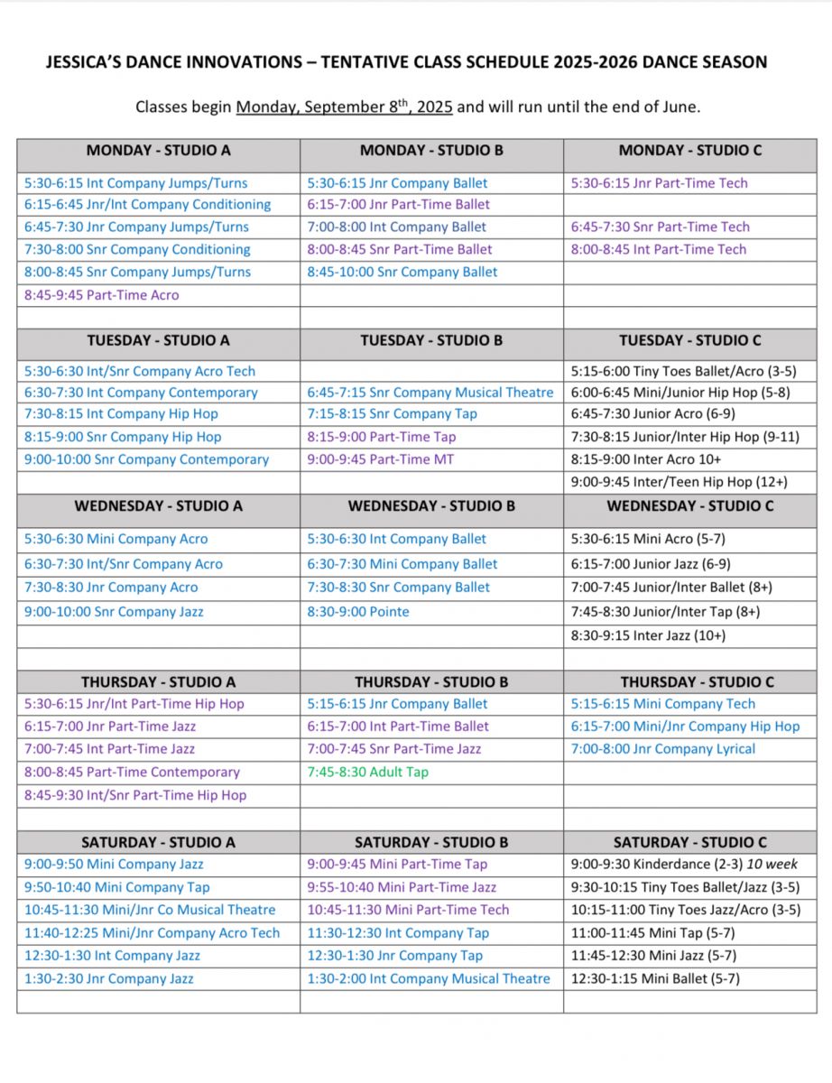 Below is our 2025-2026 Dance Schedule. All recreational classes are listed in black, full-time competitive classes are listed in blue and part-time competitive classes are listed in purple. Please be sure to email us at jessdanc@jessdanceinn.ca if you are new to the studio and have any questions about enrollment. It is important to ensure that you are registering for the appropriate programs and we are happy to help you find the best suited classes for you!